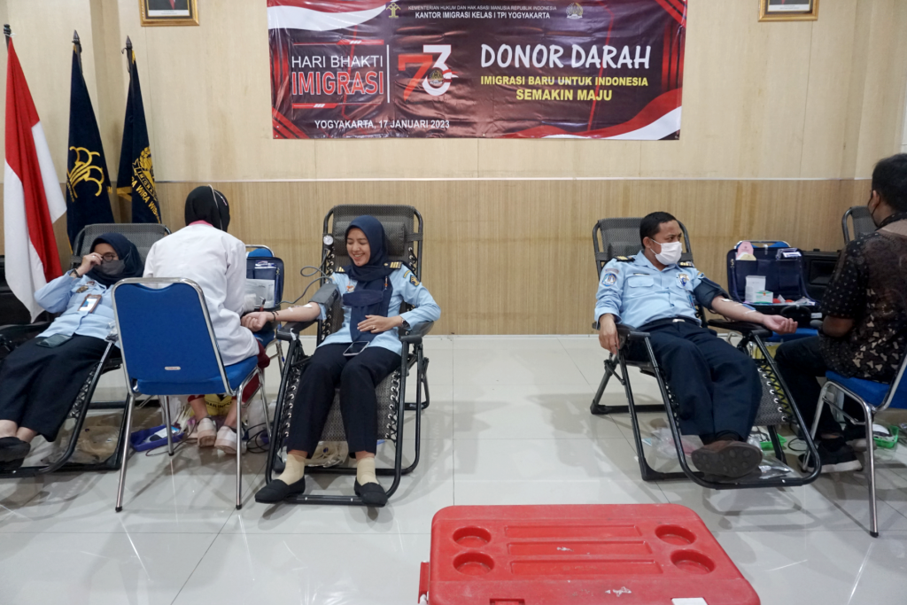Dalam rangka menyambut Hari Bhakti Imigrasi ke-73, Kantor Imigrasi Kelas I TPI Yogyakarta menggelar kegiatan donor darah. Kegiatan tersebut dilaksanakan pada Selasa (17/01/2023) di aula Kantor. Donor darah ini sendiri selain diikuti pegawai Kantor Imigrasi Yogyakarta, juga terbuka untuk masyarakat umum. Dalam mengadakan kegiatan donor darah, Kantor Imigrasi Yogyakarta menggandeng RSUP Sardjito.