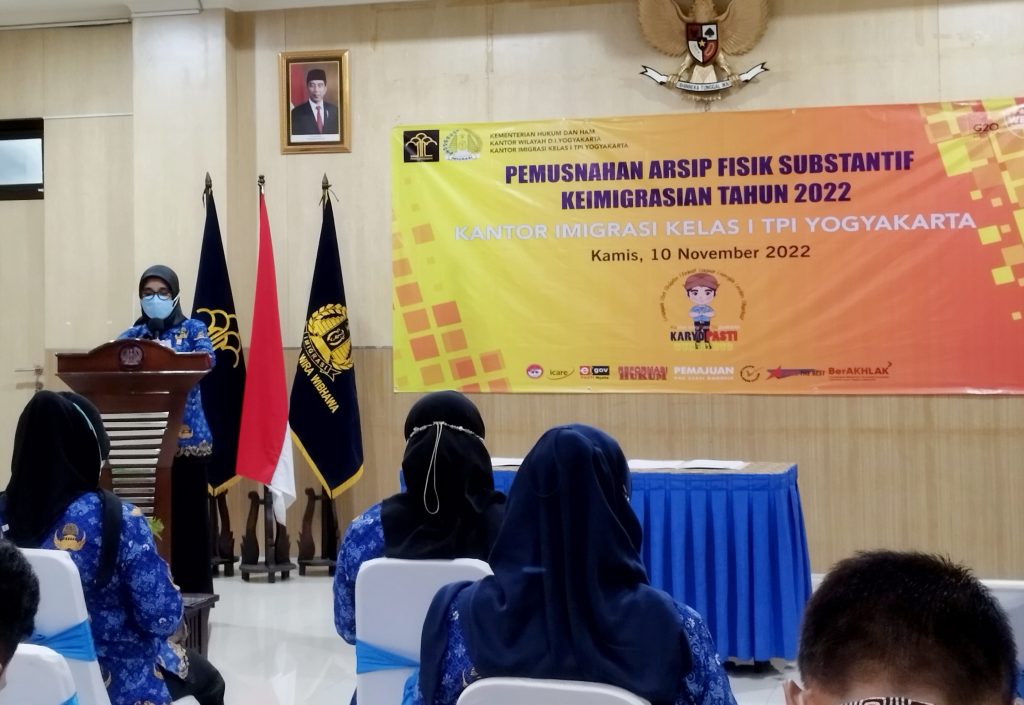 Sementara itu, Zuhria Dhamayanti selaku Subkoordinator Pengelolaan Arsip Dinamis Biro Umum Sekretariat Jenderal Kementerian Hukum dan HAM dalam sambutannya mengatakan bahwa pemusnahan arsip yang dilakukan Kantor Imigrasi Yogyakarta sangat penting. “Kegiatan pemusnahan arsip yang dilakukan oleh Kantor Imigrasi Kelas I TPI Yogyakarta adalah bukti nyata serta berkomitmen dalam pelaksanaanya pengelolaan arsip yang baik dan benar. Sehingga pemusnahan arsip ini sangat penting dilakukan dalam rangka mengurangi penumpukkan arsip,” ujarnya.