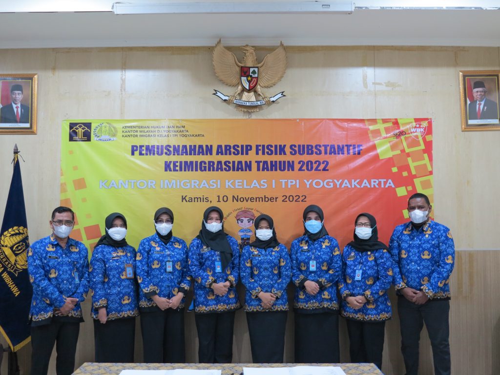 Kantor Imigrasi Kelas I TPI Yogyakarta kembali melaksanakan kegiatan Pemusnahan Arsip Fisik Subtantif Keimigrasian. Kegiatan tersebut dilaksanakan pada Kamis (10/11/2022) di aula Kantor Imigrasi Yogyakarta. Kegiatan pemusnahan arsip secara simbolis ini dihadiri oleh perwakilan dari Biro Umum Sekretariat Jenderal Kementerian Hukum dan HAM, perwakilan Direktorat Jenderal Imigrasi, perwakilan Kantor Wilayah Kementerian Hukum dan HAM D.I. Yogyakarta, perwakilan Lapas Kelas IIa Yogyakarta serta Lapas Narkotika Kelas IIa Yogyakarta.