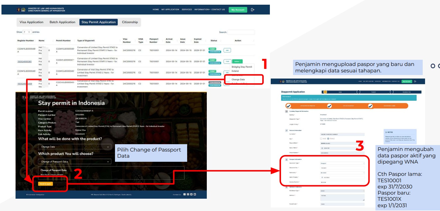 To update passport information, applicants are required to log in using their guarantor account via evisa.imigrasi.go.id, access the “My Application” menu, and select the active stay permit. Through the “Action” feature, users can choose “Change Data” followed by “Change of Passport.” Applicants must ensure that the new passport number and expiry date are manually updated in the system, as failure to do so will result in automatic rejection.