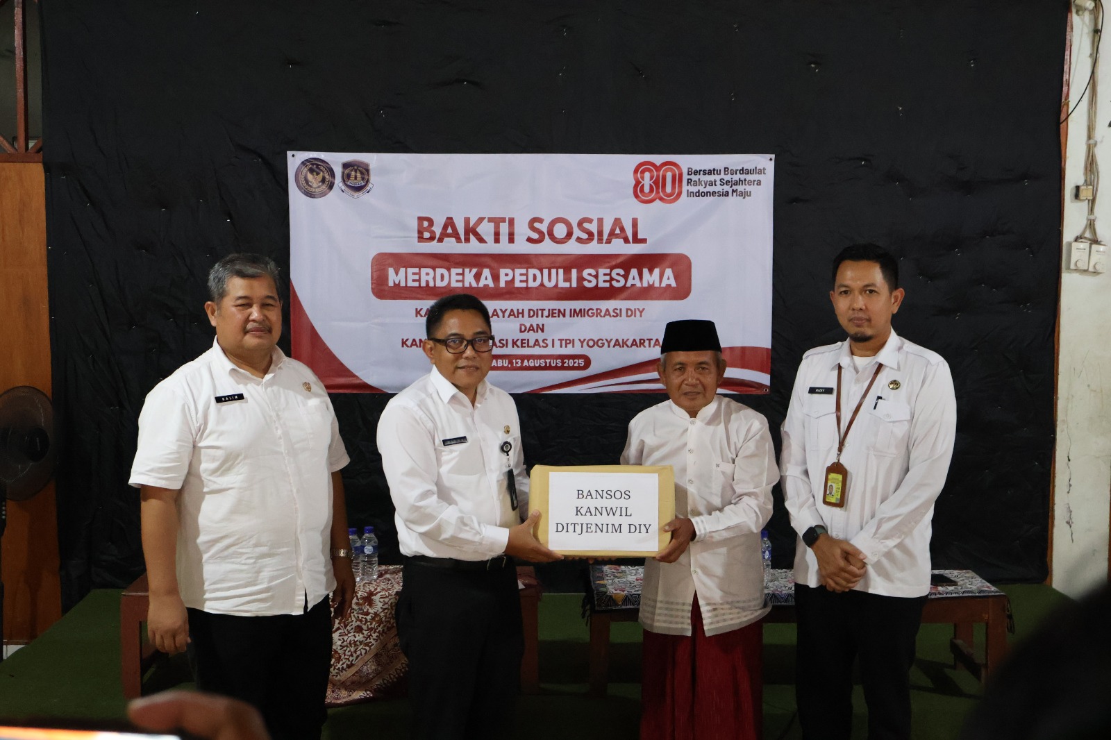 Yogyakarta, 14 Agustus 2025 – Dalam rangka memperingati Hari Kemerdekaan Republik Indonesia ke-80, Kantor Wilayah Direktorat Jenderal Imigrasi Daerah Istimewa Yogyakarta bersama Kantor Imigrasi Kelas I TPI Yogyakarta menggelar kegiatan Bakti Sosial dengan tema “Merdeka Peduli Sesama”.
