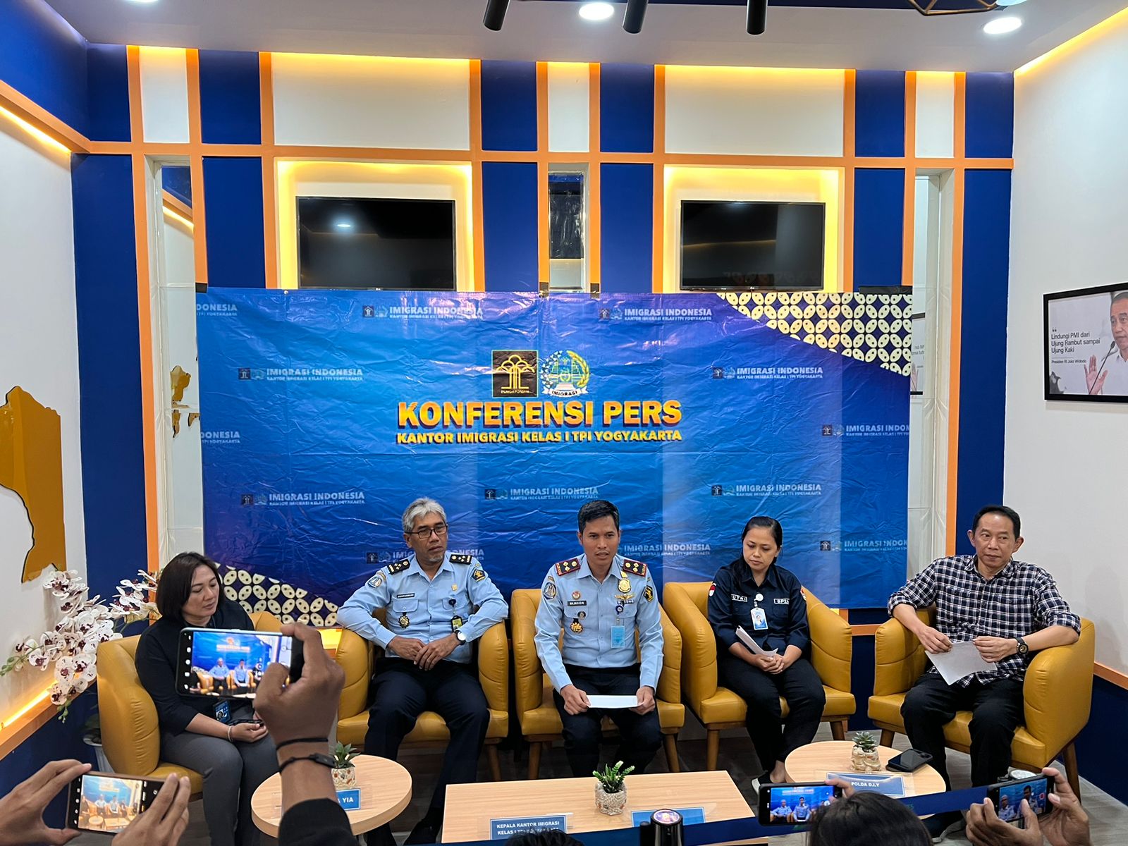 Yogyakarta – Kantor Imigrasi Kelas I TPI Yogyakarta menyelenggarakan Konferensi Pers terkait penundaan keberangkatan empat WNI yang diduga sebagai Pekerja Migran Non Prosedural di Tempat Pemeriksaan Imigrasi (TPI) Bandar Udara YIA Kulonprogo. Kegiatan tersebut dilaksanakan pada Selasa (20/06/2023) dengan menggandeng Divisi Keimigrasian Kantor Wilayah Kementerian Hukum dan HAM D.I. Yogyakarta, Polda D.I. Yogyakarta, serta BP3MI Yogyakarta.