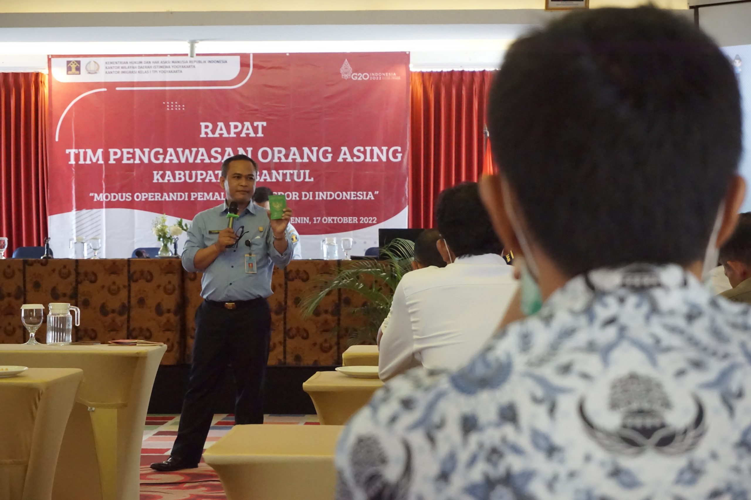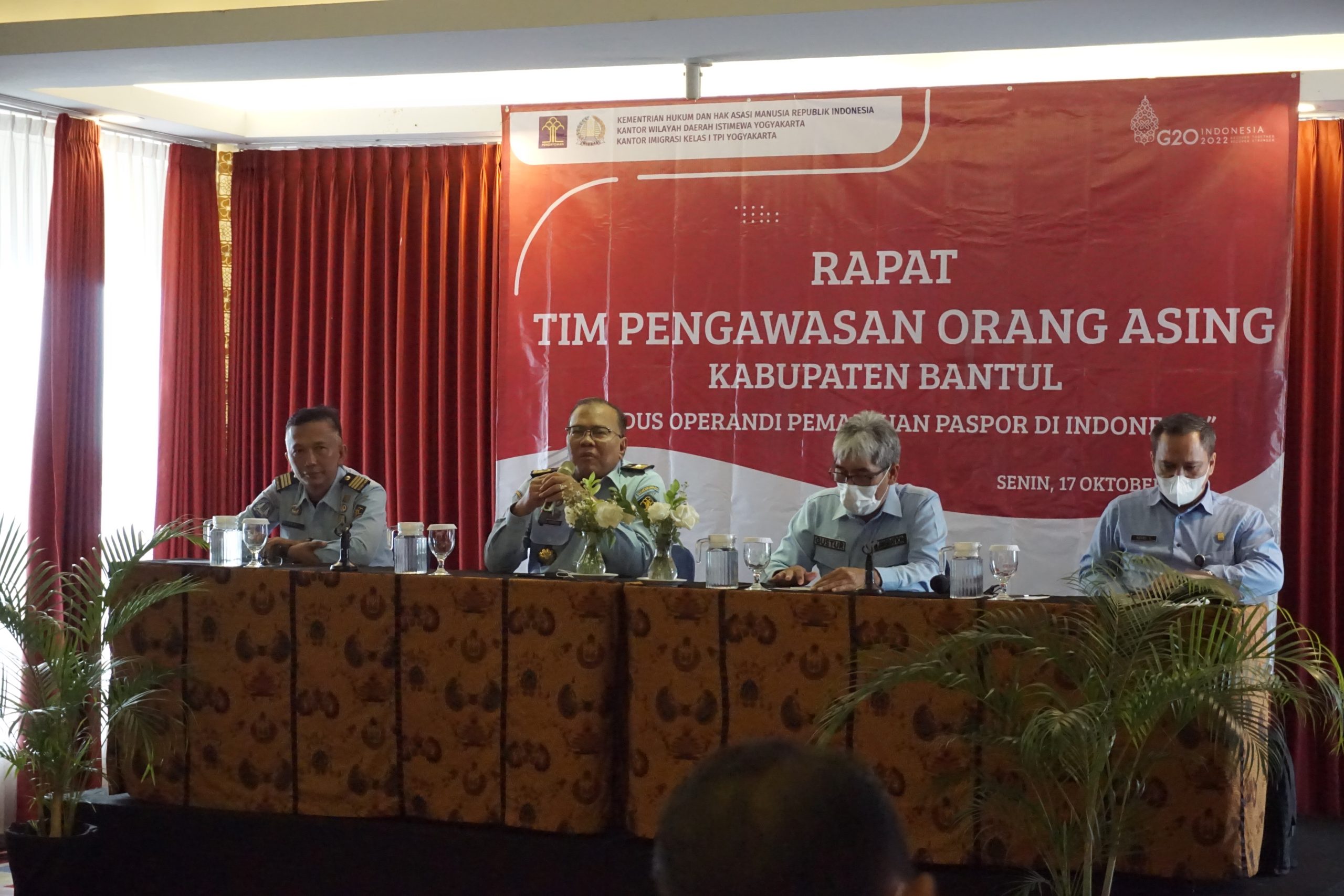 Bantul, Yogyakarta—Senin (17/10). Kantor Imigrasi Kelas I TPI Yogyakarta melaksanakan rapat tim pengawasan orang asing (Timpora) Kabupaten Bantul dengan tema “Modus Operandi Pemalsuan Paspor di Indonesiaâ€. Bertempat di KJ Hotel Yogyakarta Jl. Parangtritis No.120 Daerah Istimewa Yogyakarta, rapat ini dihadiri oleh beberapa instansi daerah yang tergabung dalam tim pengawasan orang asing Kabupaten Bantul, antara lain Badan Kesatuan Bangsa dan Politik Kabupaten Bantul, Disdukcapil Bantul, Kejaksaan Negeri Kabupaten Bantul, Komando Distrik Militer 0730/Bantul, dan Kepolisian Resor Bantul.