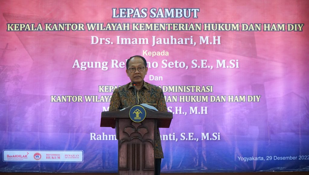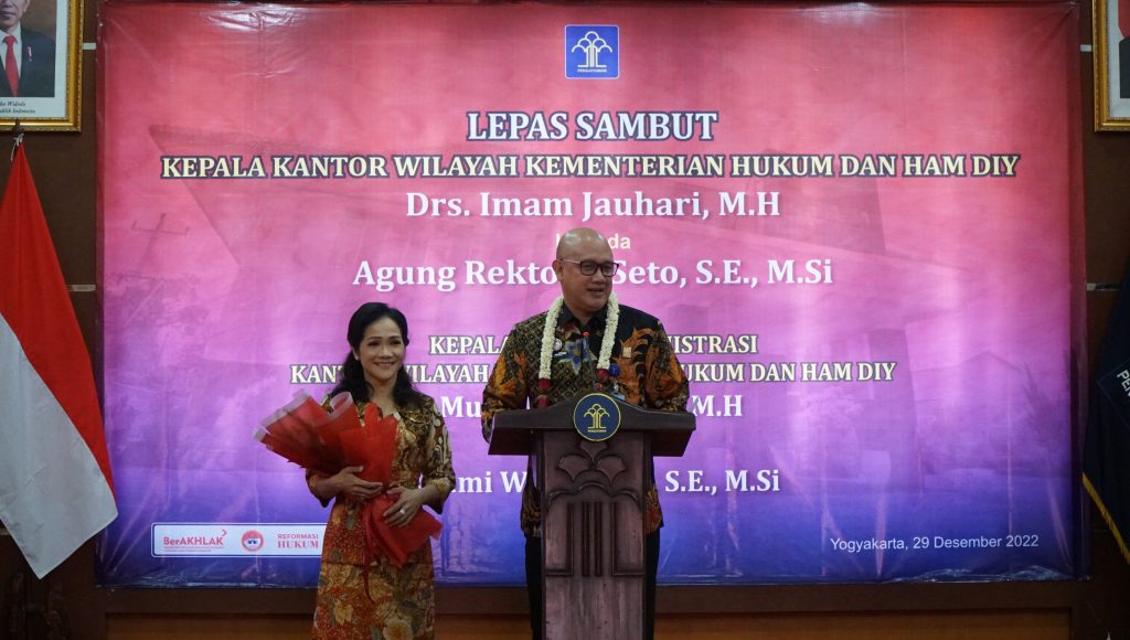 Kantor Wilayah Kementerian Hukum dan HAM (Kemenkumham) D.I. Yogyakarta melaksanakan kegiatan lepas sambut pimpinan Kantor Wilayah yang baru pada Kamis(29/12/2022). Imam Jauhari yang sebelumnya memimpin Kantor Wilayah Kemenkumham D.I. Yogyakarta, akan bertugas sebagai Kepala Kantor Wilayah Kemenkumham Jawa Timur. Imam digantikan oleh Agung Rektono Seto yang sebelumnya menjabat sebagai Kepala Kantor Wilayah Kemenkumham Kepulauan Riau. Selain itu pisah sambut Kepala Kantor Wilayah, pada kesempatan ini juga dilaksanakan pisah sambut Kepala Divisi Administrasi. Mutia Farida yang sebelumnya menjabat sebagai Kepala Divisi Administrasi di Kantor Wilayah Kemenkumham D.I.Yogyakarta, digantikan oleh Rahmi Widhiyanti. Mutia Farida akan melanjutkan tugas sebagai Kepala Divisi Administrasi di Kantor Wilayah Kemenkumham DKI Jakarta.