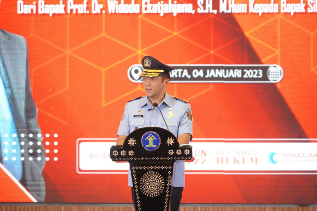 Pada kesempatan tersebut, Menkumham apresiasi dan terima kasih kepada Plt Dirjen Imigrasi, Widodo Eka Tjahjana, yang telah membantu dirinya memimpin sebagai Plh Dirjen Imigrasi pada masa-masa sulit Covid-19. “Banyak terobosan, banyak inovasi yang telah kita lakukan tentunya, mulai dari e-Visa, M-Paspor, paspor 10 tahun, kemudian e-VoA, Second Home Visa,” katanya. Kemudian Menkumham juga memuji Imigrasi yang berhasil dalam penyelenggaraan dua perhelatan besar yaitu GPDRR dan G20.