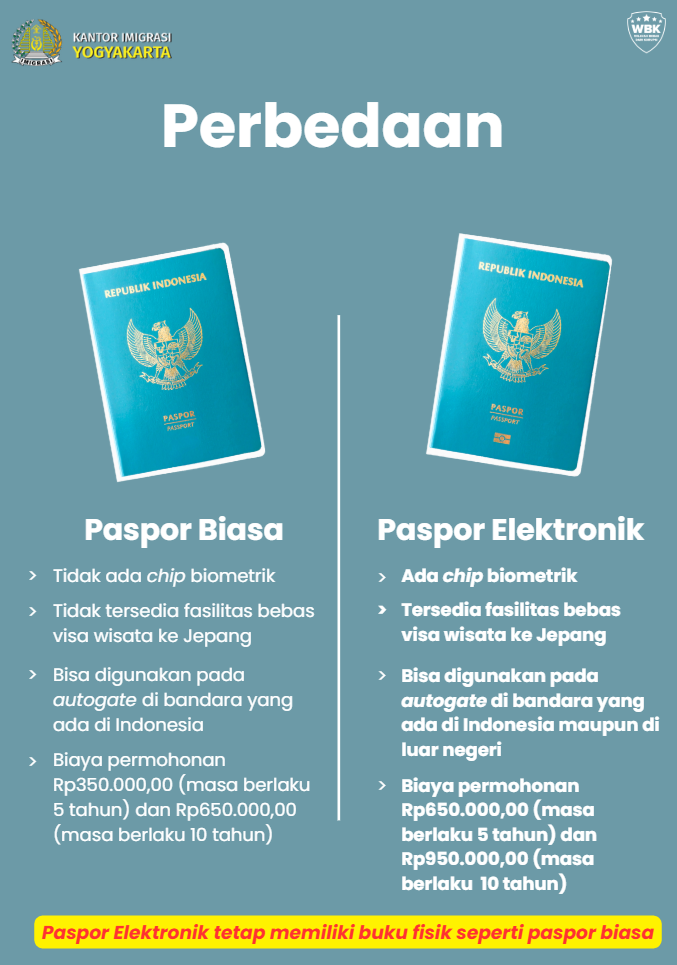 Perbedaan paspor biasa dan elektronik menjadi salah satu topik hangat yang ditanyakan banyak pemohon paspor, khususnya saat akan memilih pada aplikasi M-Paspor walau saat ini paspor biasa non elektronik sudah tidak diterbitkan lagi di Kantor Imigrasi Kelas I TPI Yogyakarta. Untuk pengurusan paspor biasa non elektronik, silahkan ditanyakan ketersediaan layanan pada Kantor Imigrasi tempat anda akan mengurus paspor.