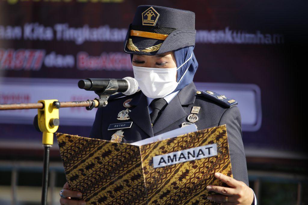 Sebagai inspektur upacara adalah Kepala Subbagian Tata Usaha, Retno Dewi Banowati. Dalam amanatnya Retno Dewi membacakan sambutan dari Menteri Hukum dan HAM. Pada sambutan ini Menteri Hukum dan HAM menyampaikan bahwa bertambahnya usia Kementerian Hukum dan HAM ke-77 harus dimaknai dengan merefleksikan kembali dan introspeksi serta menyusun tindak lanjut ke depan untuk mewujudkan Kementerian Hukum dan HAM menuju organisasi kelas dunia dan memiliki keunggulan kompetitif memasuki era society 5.0.