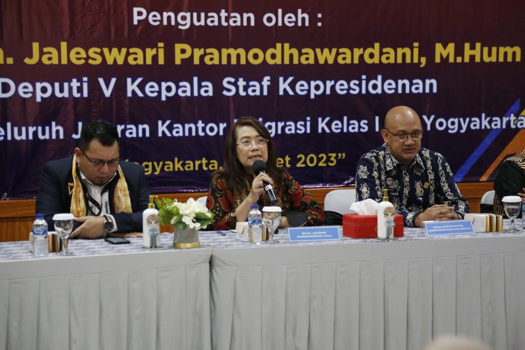 Dalam kesempatan yang sama, Jaleswari Pramodhawardani selaku pimpinan rombongan Kantor Staf Presiden mengatakan bahwa kunjungan tim Kantor Staf Presiden dalam rangka menindaklanjuti arahan presiden terkait dengan pelayanan masyarakat dan orang asing serta hal-hal yang terkait penindakan hukum. “Kami ingin mendapatkan gambaran identifikasi persoalan yang ada di Kantor Imigrasi Yogyakarta dan apa yang dibutuhkan dari kami,” tuturnya.